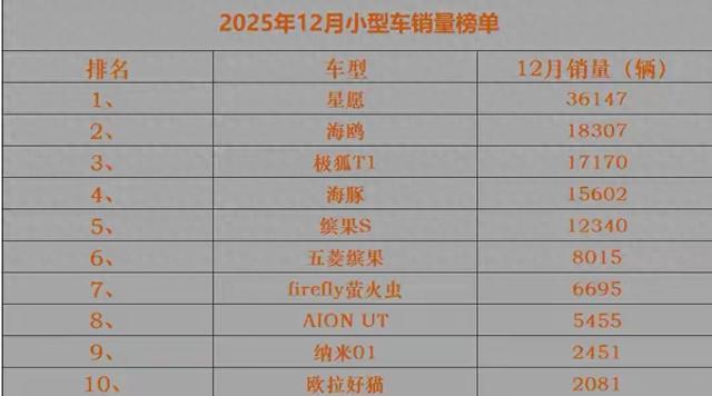 12月小型汽车销量排行,星愿以3.6万辆强势夺冠