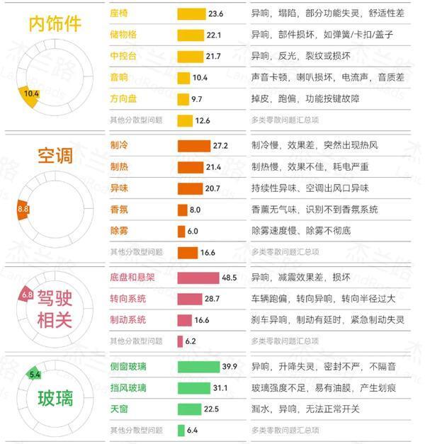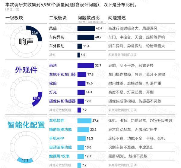 本次研究构建了多维度评价体系,从三大核心维度延伸出8个一级板块与35个二级板块,系统梳理车主反馈的各类问题。调研共收集有效问题6950项,其中质量问题与设计缺陷占比近乎持平。值得关注的是,响声相关问题以24.6%的占比位居首位,主要集中在高速行驶风噪与车内异响;外观件问题多出现于高频使用部件,而智能化配置中的车机系统稳定性问题也成为行业普遍痛点。