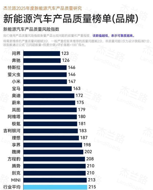 在备受关注的《新能源汽车产品质量榜单(品牌)》中,排名以“质量风险指数”为核心依据,指数越低代表产品可靠性越高。最终,问界以123的超低指数脱颖而出,成功超越奔驰(126)登顶榜首,展现出中国品牌在新能源汽车质量领域的强劲实力。特斯拉与萤火虫以146的指数并列第三,小米(147)紧随其后,宝马(163)、奥迪(172)、蔚来(175)、岚图(179)、阿维塔(180)依次进入质量表现前十阵营。