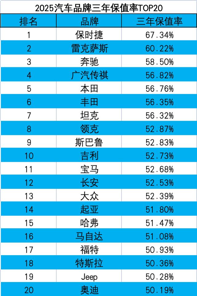 2025年汽车保值率报告显示,车企保值率排名榜上,保时捷以三年67.34%的保值率继续领跑,雷克萨斯以60.22%位居次席,在所有品牌中,也只有这两家企业三年保值率超过60%。不过,只要对比一下2024年的汽车品牌三年保值率数据,保时捷当时还达到了73%。自主品牌中,广汽传祺表现抢眼,不仅位居自主品牌阵营榜首,而且以56.82%的三年保值率,力压本田丰田等以保值出名的日系品牌。