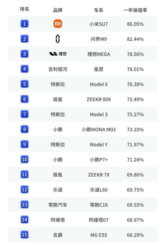 新能源车一年保值率榜单里面,小米SU7保值率高达86.05%,成为2025年最保值新能源车型。纯电车型榜单中,问界M9以82.44%紧随小米SU7之后。