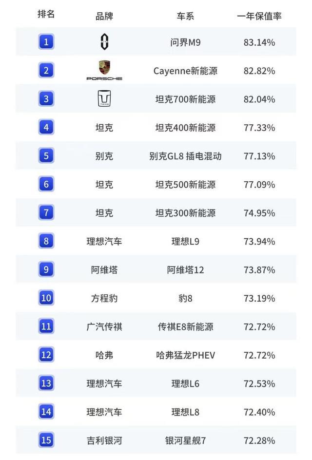 插混车型方面,问界M9的插混版一年保值率为83.14%,以微弱优势超过保时捷卡宴的插混版,排在第一位。