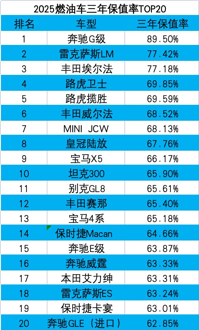 具体到车型方面,奔驰G级三年保值率达89.50%,高居榜首。