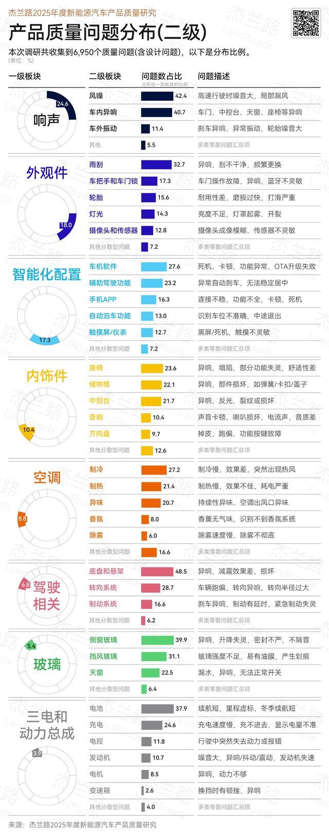 这份由独立汽车数据分析机构杰兰路发布的研究,覆盖了57个品牌,回收超5700份有效样本,聚焦车主拥车2-12个月内的真实反馈,系统梳理了6950项质量问题与设计缺陷,为消费者提供了直观的购车参考。