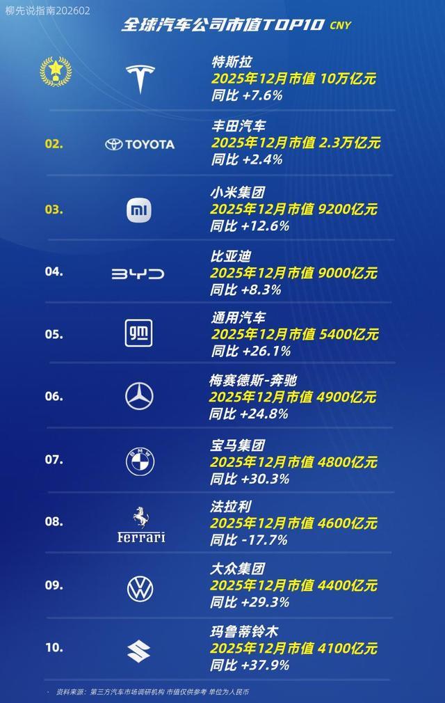全球汽车公司市值前五名:特斯拉、丰田汽车、小米集团、比亚迪以及通用汽车。排在第四位的比亚迪,市值在9000亿上下,2025年全年销量持续领跑全球新能源汽车市场;排名第三的小米集团,去年市值一度突破1万亿元人民币,下半年逐渐回落,同比增长12%。近两年实现了汽车与手机、智能家居等产品的无缝互联,在年轻消费群体中拥有极高的人气。