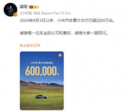 小米汽车交付破60万辆,YU7登顶1月零售销量排行榜,批发销量排名第五 红星资本局2月13日消息,小米集团(01810.HK)董事长雷军宣布,自2024年4月3日以来,小米汽车累计交付量已超过60万台。他同时表示,新一代小米SU7的展车已经到店。1月7日,新一代SU7开启小订,预售价22.99万元起,预 ... 汽车用品02-15