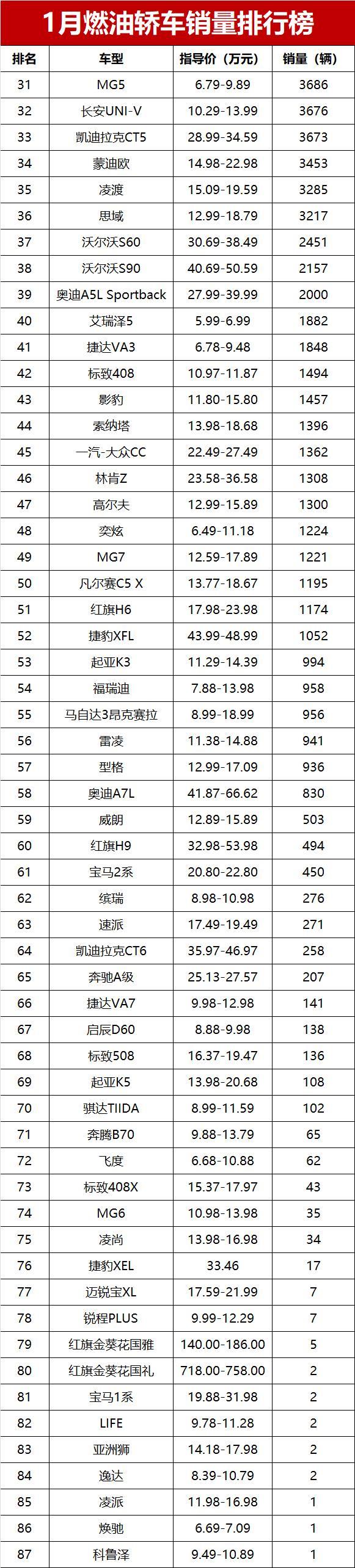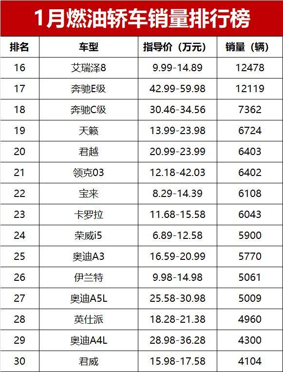 碾压新能源!1月燃油轿车销量榜,17款车破万辆,合资车霸占前五
