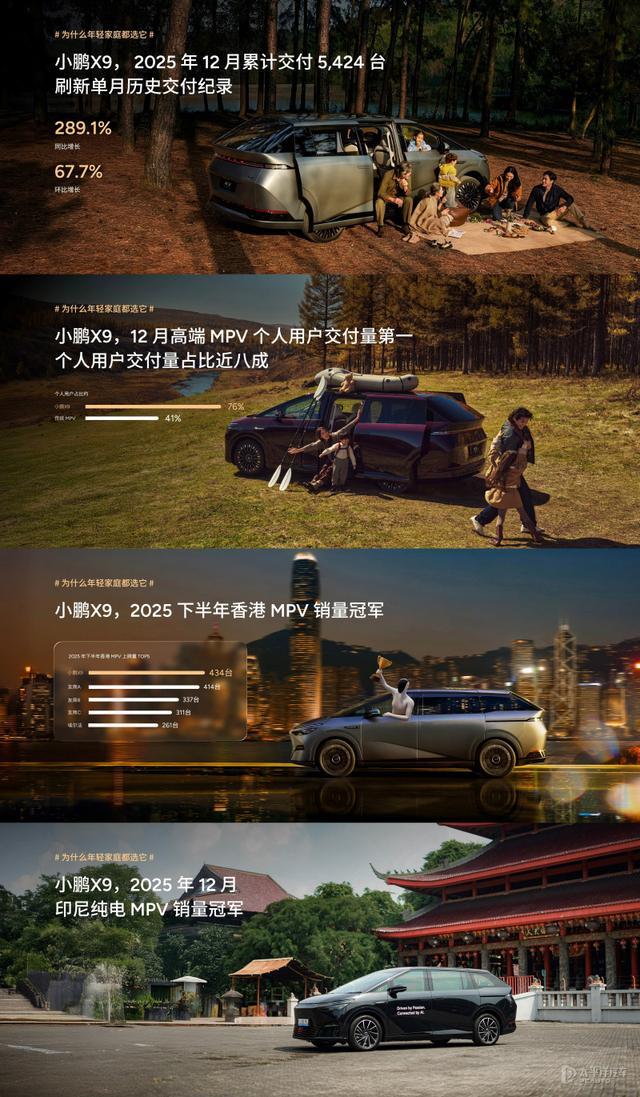 小鹏汽车在2025年的销量增长得益于多款车型在各自细分市场的强势表现。小鹏X9在12月交付量达5,424台,创该车型单月最高交付纪录,环比增长67.7%,同比激增289.1%。这款MPV车型凭借1602km综合续航等产品实力,成为增程MPV市场的领导者。