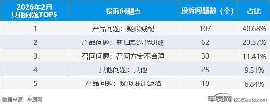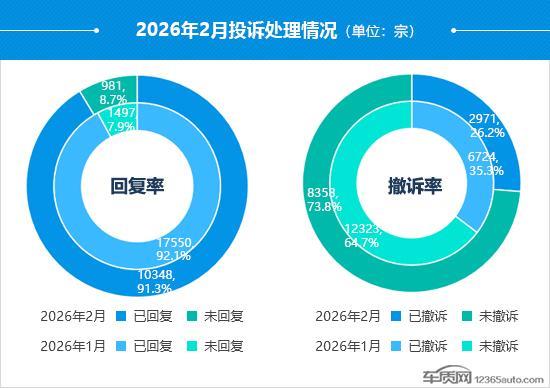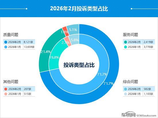 据国内领先的缺陷汽车产品信息收集和汽车消费者投诉信息受理平台车质网统计,2026年2月共受理车主有效投诉信息11,369宗(其中含第三方平台和后装轮胎投诉共40宗),环比下降约40.5%,同比下降71.6%。