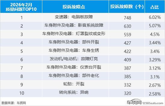 2026年2月国内汽车投诉排行及分析报告 据国内领先的缺陷汽车产品信息收集和汽车消费者投诉信息受理平台车质网统计,2026年2月共受理车主有效投诉信息11,369宗(其中含第三方平台和后装轮胎投诉共40宗),环比下降约40.5%,同比下降71.6%。 数据显 ... 汽车用品03-05
