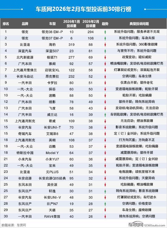 数据显示,本月车质网受理的有效投诉信息共涉及801款车型,其中投诉达两位数(含)以上的车型共146款。此外,车质网本月共接到车企针对投诉的回复11,693条(含部分之前月份投诉的回复)。在去除投诉人因为车企解决得当而自愿申请撤诉的信息后,2026年2月投诉量前30的车系(车型)排名如下: