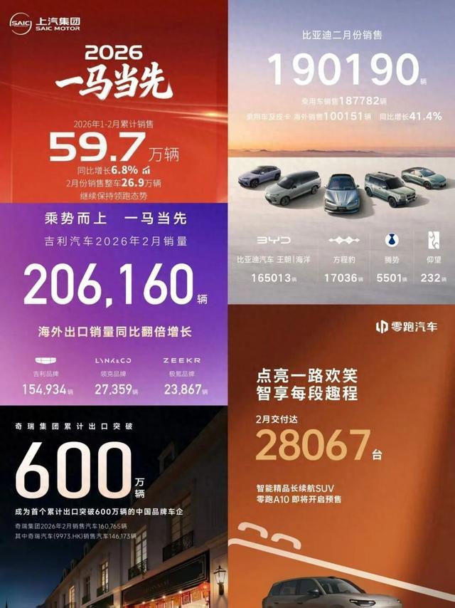 3月以来,上汽、比亚迪、吉利和奇瑞等主流车企陆续披露2026年1-2月销量成绩单。整体上看,在假期导致销售工作日缩减、消费者持币观望情绪的背景下,车市仍呈现出激烈的竞争态势:有人稳坐总量榜首,有人领跑新能源赛道,有人则在出海战场实现突破。