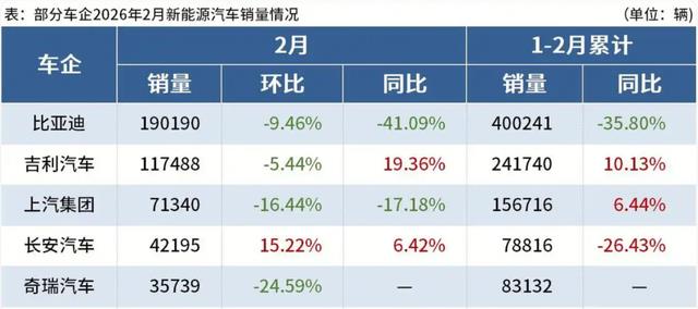 2026年1-2月,比亚迪累计新能源销量达40.02万辆,尽管同比下滑35.8%,但依然以绝对优势领跑新能源赛道,远超第二名吉利汽车(24.17万辆),相当于奇瑞、东风、长安、长城四大集团新能源销量的总和,展现出一枝独秀的实力。