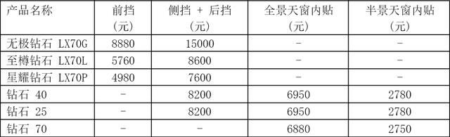 从价格体系来看,钻石系列在天窗贴膜方面提供了更加细化的选择,满足消费者对天窗隔热、防晒的个性化需求。