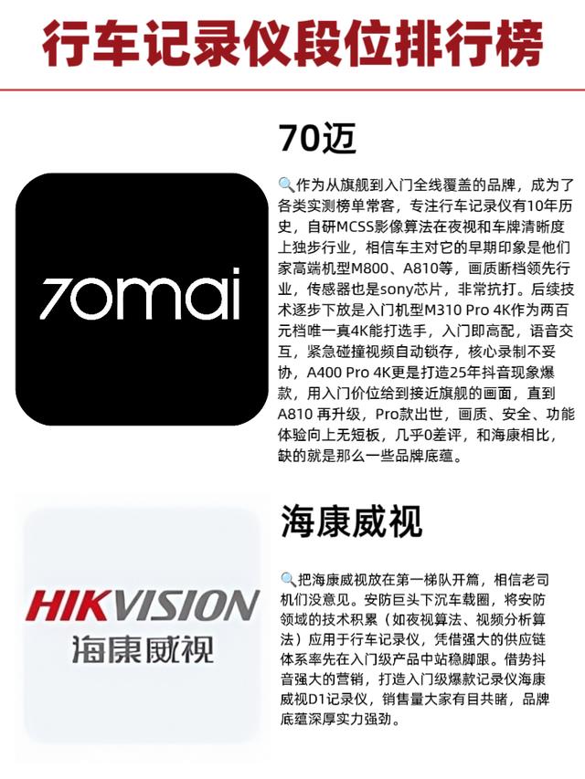 作为从旗舰到入门全线覆盖的品牌,成为了各类实测榜单常客,专注行车记录仪有10年历史,自研MCSS影像算法在夜视和车牌清晰度上独步行业,相信车主对它的早期印象是他们家高端机型M800、A810等,画质断档领先行业,传感器也是sony芯片,非常抗打。后续技术逐步下放是入门机型M310 Pro 4K作为两百元档唯一真4K能打选手,入门即高配,语音交互,紧急碰撞视频自动锁存,核心录制不妥协,A400 Pro 4K更是打造25年抖音现象爆款,用入门价位给到接近旗舰的画面,直到A810 再升级,Pro款出世,画质、安全、功能体验向上无短板,几乎0差评,和海康相比,缺的就是那么一些品牌底蕴。