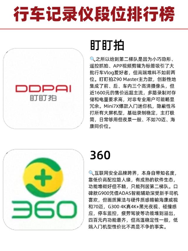 互联网安全品牌跨界,本身自带知名度,靠低价高配拉路人缘,有成熟的软件生态,功能堆砌好但不精,只能列居第二梯队。口碑款G900凭借ADAS智能辅助深受新手司机喜欢,但画质算法与硬件质感略输海康威视和70迈,G300 4K真4K+黑光夜视、碰撞感应,停车监控,疲劳驾驶等功能堆到溢出,四百元内功能最齐,但高温稳定性一般,低端入门机型性价比不高是不争的事实。