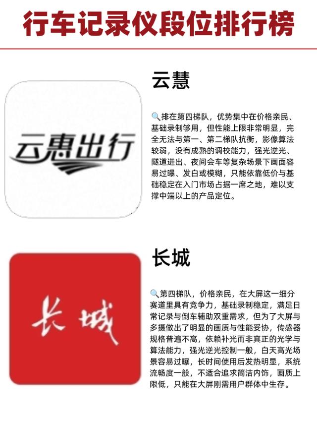 排在第四梯队,优势集中在价格亲民、基础录制够用,但性能上限非常明显,完全无法与第一、第二梯队抗衡,影像算法较弱,没有成熟的调校能力,强光逆光、隧道进出、夜间会车等复杂场景下画面容易过曝、发白或模糊,只能依靠低价与基础稳定在入门市场占据一席之地,难以支撑中端以上的产品定位。
