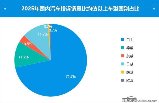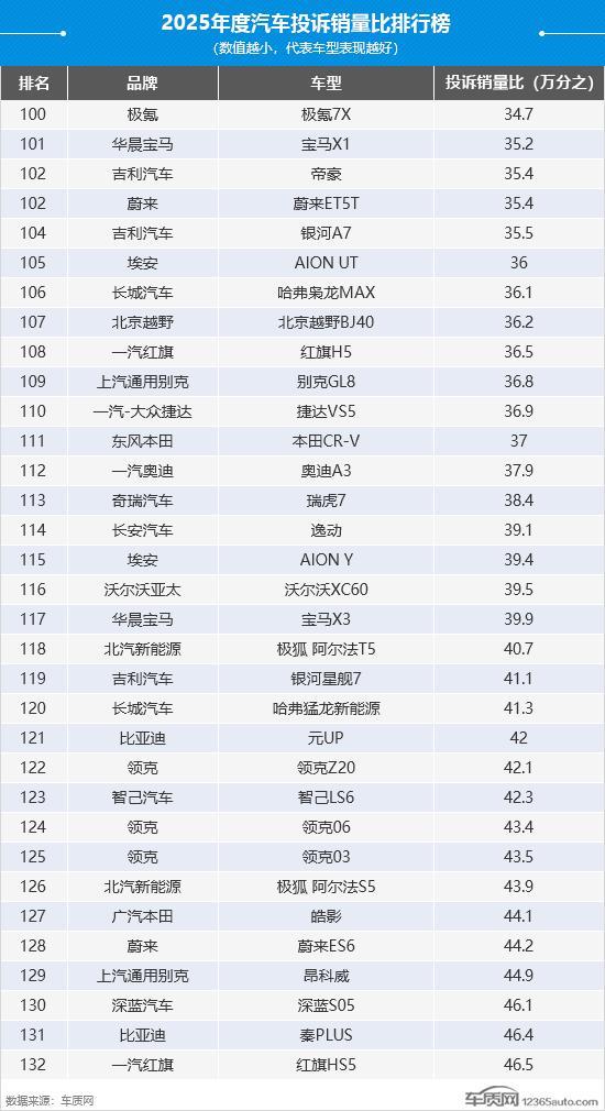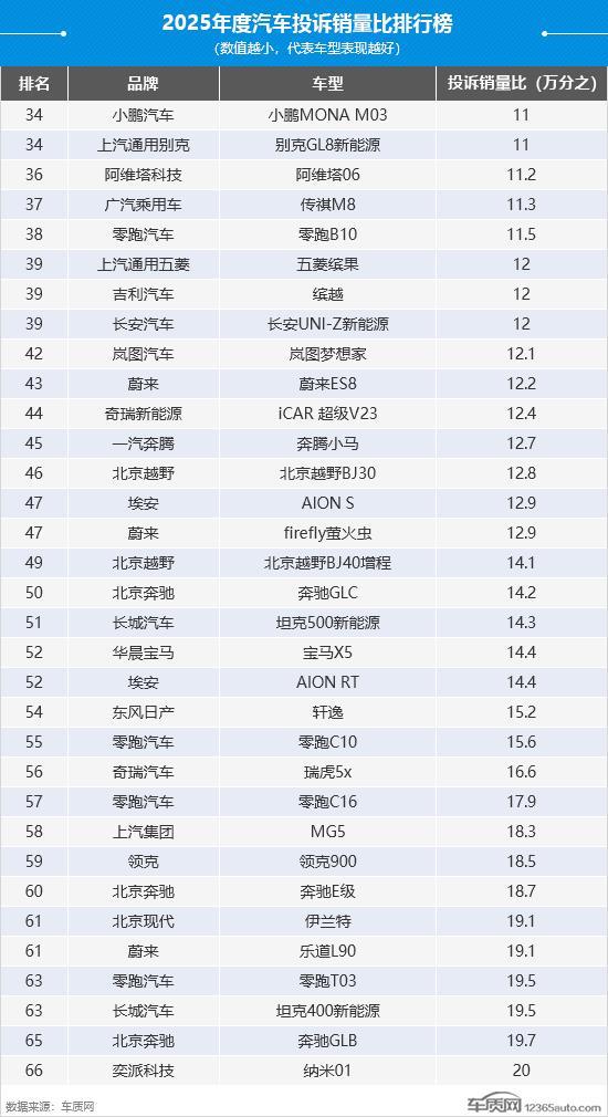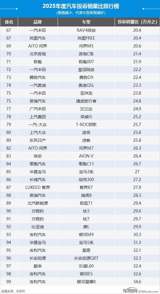 2025年度国内汽车投诉销量比排行榜