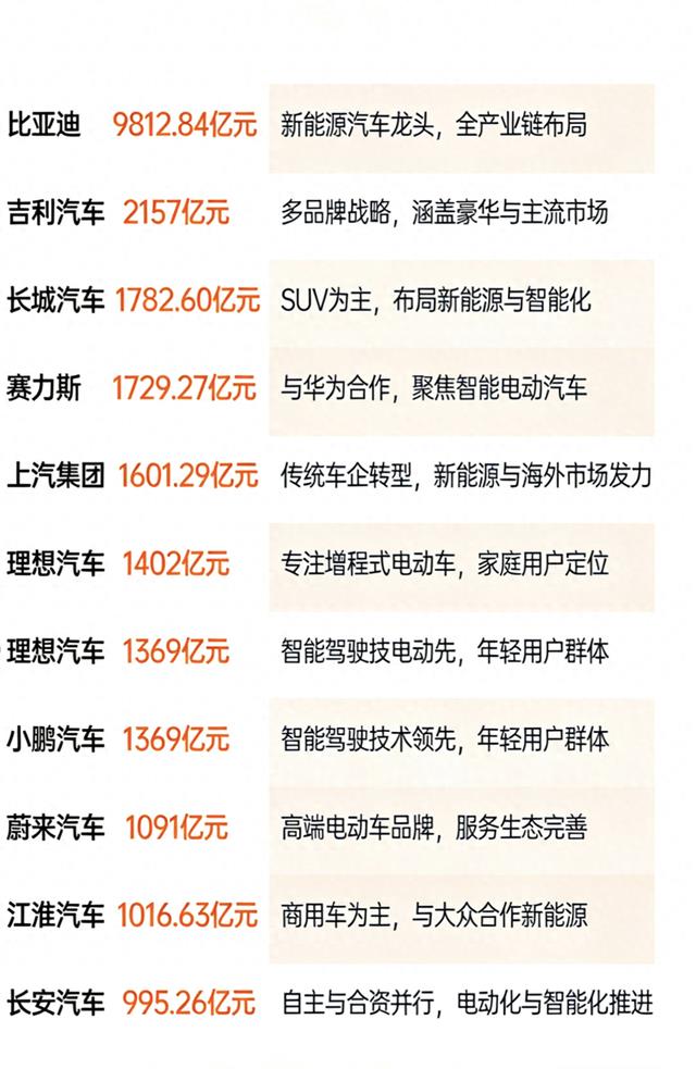 5 | 赛力斯 (Seres) | 华为深度赋能模式的典范,高端智能电动车黑马。凭借问界系列在高端市场异军突起,与华为的智选车模式成为行业焦点。市值在合作深化与新车型周期推动下实现跨越式增长。 | 约1,737 - 2,113亿元(A股) | (问界系列为现象级产品,销量引领高端新能源市场) |