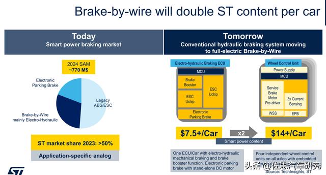 汽车制动领域,ST市场占有率超过50%,全电子线控目前还未出现在量产车上,未来也是最早出现在商用车上,乘用车很难使用全电子线控,不过EPB覆盖率预计很快就会接近100%。