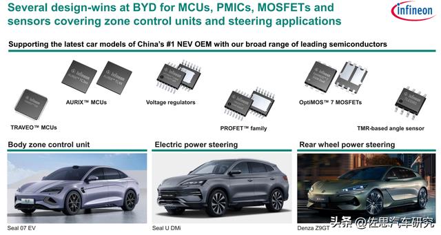 英飞凌从全球第一电动车厂家比亚迪那里获得大笔订单,包括区域域控制器和转向系统使用的MCU和MOSFET,Seal U在中国本土就是宋PLUS冠军版,Seal 07是比亚迪高端车型即海豹07,Denza即腾势,Z9GT是腾势高端产品,具备后轮转向功能。小米SU7使用英飞凌超过60个元件,包括昂贵的1200V SiC模块两个。