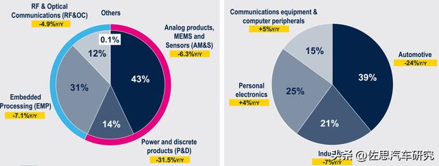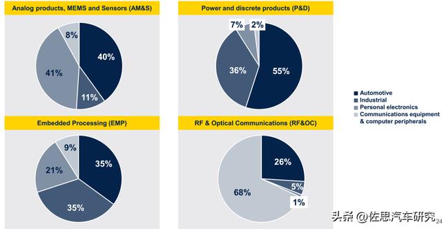 2025年ST收入下游分布中,汽车在功率与分离元件部门所占比例高达55%。