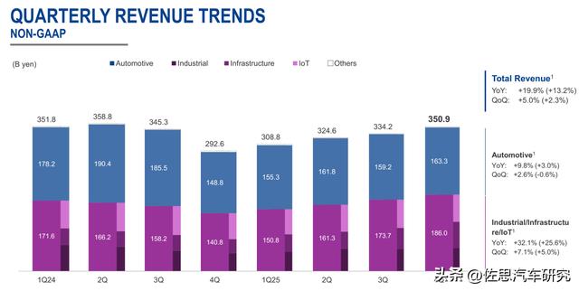 自2024年开始,电动车的竞争逐渐从续航里程,充电速度转移到智能化领域,还有就是增程车持续蚕食纯电车市场,以SiC为代表的功率半导体需求暴跌,但前期各大厂都强烈看好SiC,产能拓展投入巨大,不得不流血竞争,Wolfspeed也因此破产,专注SiC的厂家均遭遇重创,意法半导体继续暴跌,安森美也加入暴跌队伍,瑞萨则因为提前给Wolfspeed支付超过20亿美元现金订购SiC产品而巨额亏损,英飞凌也受到打击,但依靠高端MCU的强力拉动,英飞凌总体收入还略有增长,但利润下滑。