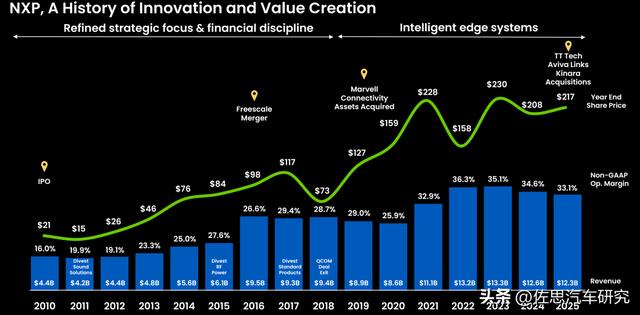 NXP 2010-2025年收入、股价和重大收购