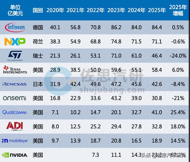 2020-2025年全球10大汽车半导体厂家收入排名