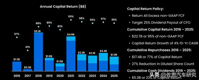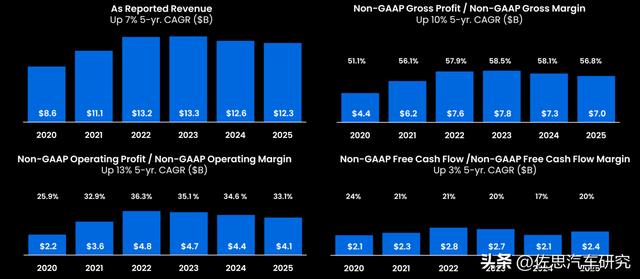 NXP分汽车、移动手持、工业与IoT和通讯基础四个事业部,汽车占总体收入比例在2025年达58%,2024年达到57%,比2023年的56%略高。2025年NXP整体收入为123亿美元,同比下滑2.8%。毛利率56.8%,去年同期为58.1%。营业利润率33.1%,去年同期为34.6%。NXP预计2027年整体收入将达160亿美元,其中汽车业务收入95亿美元。预计2026年汽车业务有近10%的增长。