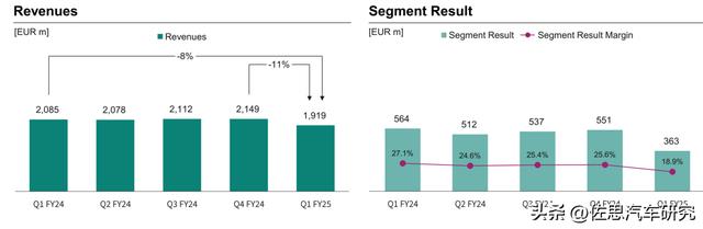 2024自然年4季度-2025自然年4季度每季度英飞凌汽车业务收入与营业利润率,和2023年比下滑比较明显。