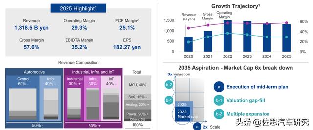 瑞萨2025年整体收入是13185亿日元,同比微跌2.2%,折合美元为87.9亿美元,同比下滑1.6%。2025年汽车业务收入是42.6亿美元,同比下滑8.4%;毛利率是54.1%,比2024年的52.3%还有所增加。不过2025年营业利润率30.7%,较2024年的31.7%有所下滑。2023年日元兑美元平均汇率是140,2024贬值到154,2025年则略微升值到150。