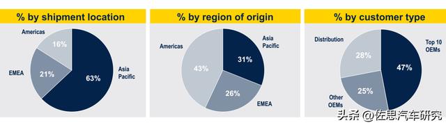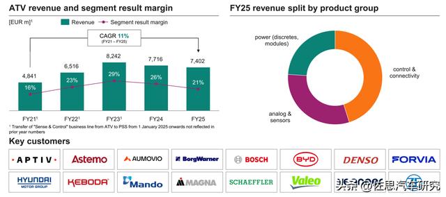 2024财年功率半导体占英飞凌51%收入,MCU占大约38%,存储和传感器加起来约为11%。相比2022财年,MCU所占的幅度显著增加,2022财年MCU只占26%。2025财年功率半导体收入大幅暴跌到只有大约26%,MCU和以太网连接业务收入所占比例增加到47%,存储、模拟和传感器大幅增至27%。英飞凌汽车事业部的十六大客户见上图,包括比亚迪、国内上市公司科博达Keboda、美国安波福、日立汽车Astemo、博世、大陆汽车、电装、现代汽车、法雷奥、Veoneer、麦格纳、舍弗勒、韩国Mando、Vitesco(纬湃,由大陆汽车动力总成事业部分拆而来)、ZF、佛吉亚与Hella合并后的FORVIA。