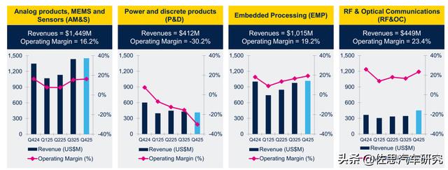 2025年ST收入分布如上图所示,功率和分离元件部门暴跌31.5%。