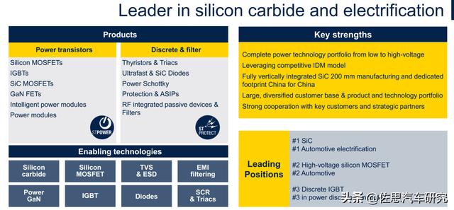 汽车SiC领域,ST是特斯拉独家供应商,市场占有率第一,汽车用高压MOSFET领域市场占有率第二,分离型IGBT市场,全球市场占有率第三。