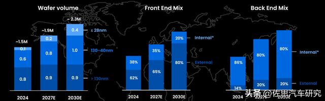 NXP在2024年晶圆大约150万片,其中80万片大于130纳米,60万片介于40到130纳米,10万片在28纳米以下,前端晶圆有40%内部完成,预计2027年内部完成率降至35%,2030年降低到20%,加大外包前端制造力度。后端80%还是内部完成。