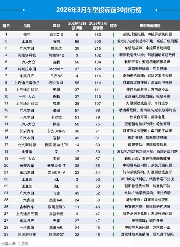 3月国内汽车投诉榜单(TOP30),合资品牌燃油车机械故障成重灾区 《车矩阵》行业点评:国内领先的汽车缺陷产品信息收集和消费者投诉专业平台近期新鲜发布了2026年3月国内汽车投诉排行榜单(TOP30),信息显示,3月份消费者共接受车主有效信息投诉18835宗,同比下降16.5%。作为车主 ... 汽车用品04-05