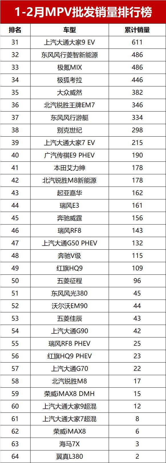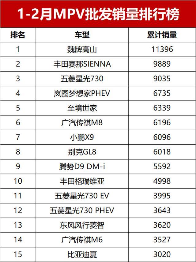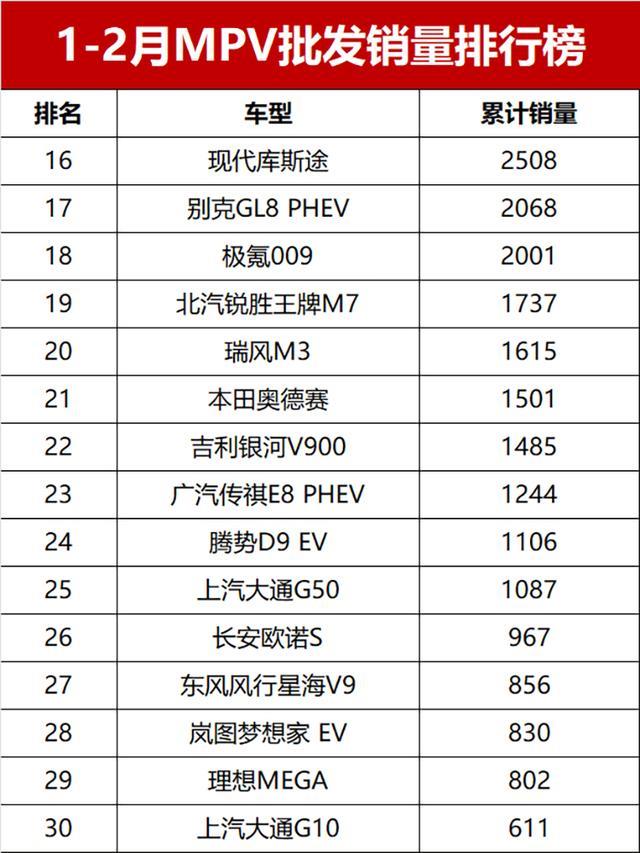凄凉!1-2月MPV批发销量排名,仅1款车破万,别克GL8第八