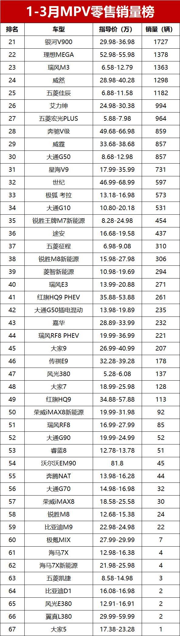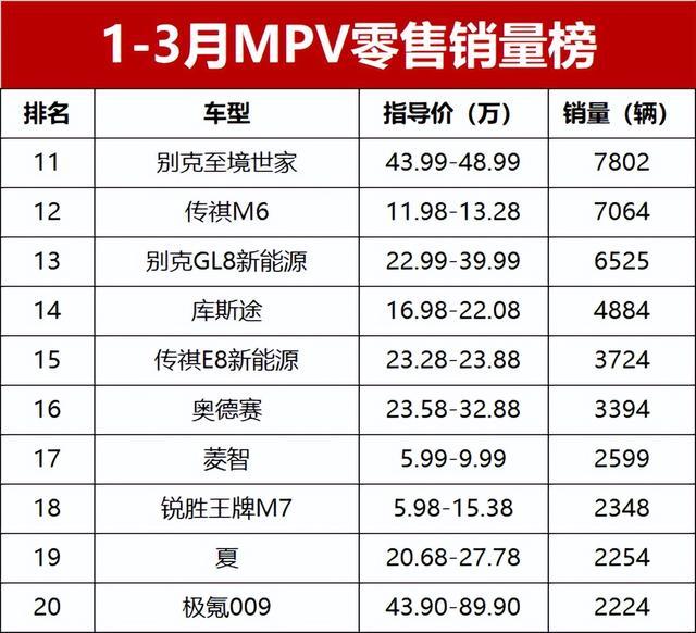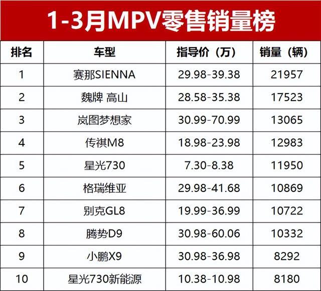 大洗牌!一季度MPV零售榜,燃油车霸榜,GL8第七,前销冠降至第八