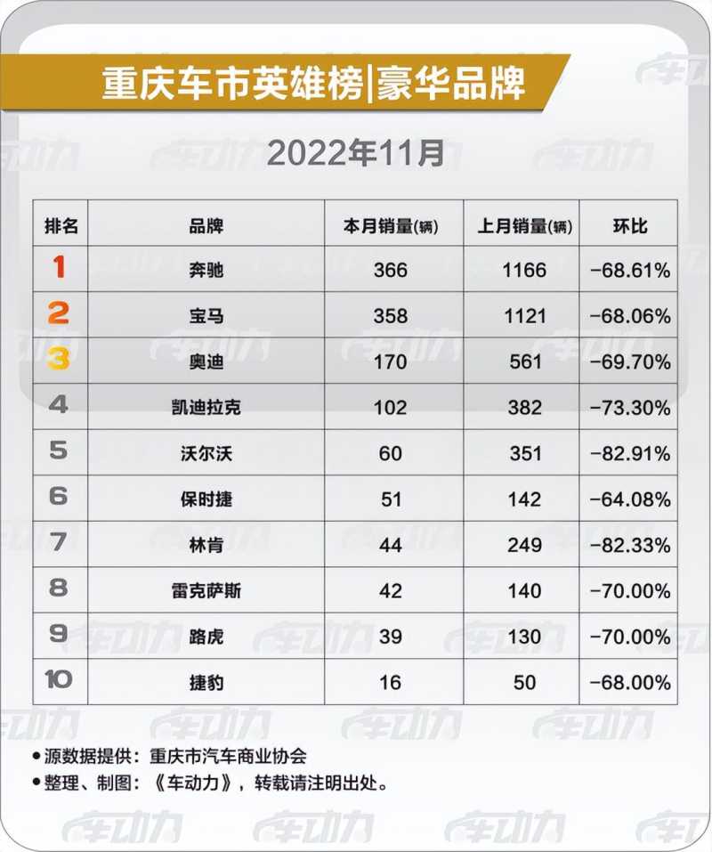 受疫情影响,11月的重庆豪华品牌市场可谓遭到了全面重击,所有品牌环比跌幅均超过60%。接下来,我们就一起去具体看看。