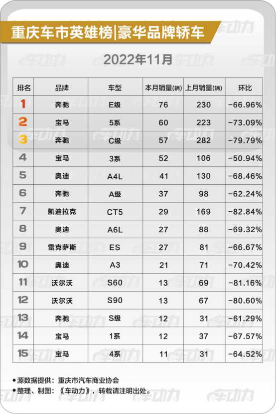 再看11月的《重庆车市|豪华品牌轿车》销量分榜——除宝马3系之外,所有上榜车型销量跌幅均超过6成。