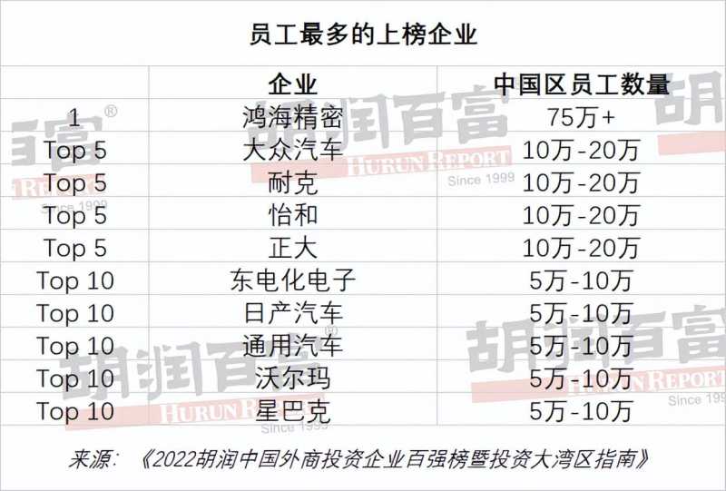 外商百强企业中,员工最多的是鸿海精密,在中国拥有超过75万名员工。大众汽车、耐克、怡和、正大等企业在中国员工均超10万人。