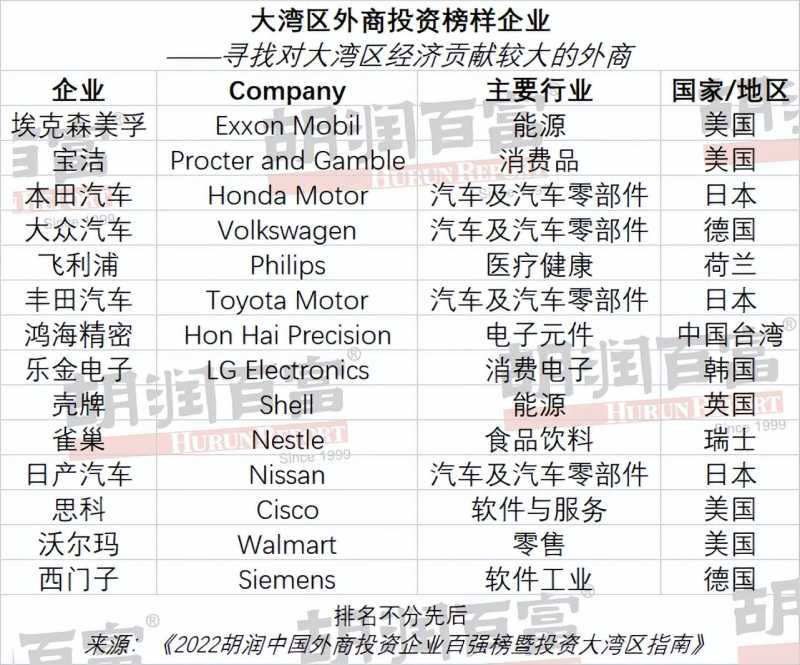 以下是胡润百富统计的大湾区外商投资榜样企业: