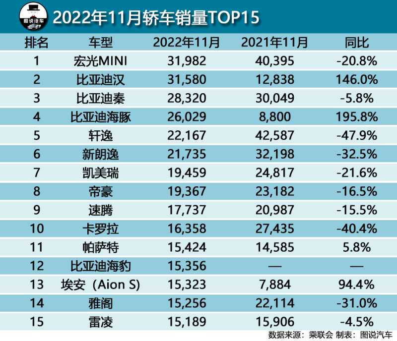这算是国产轿车的高光时刻,从11月的轿车销量榜单来看,上榜共有15款车型,其中国产车上榜7席,占据了半壁江山。榜单前四都是国产车,昔日的夺冠热门日产轩逸,在11月被挤下神坛,位列榜单第五位,销量也只有22167辆,榜单前四分别是宏光MINI EV以及比亚迪的汉、秦和海豚三款爆款车型,销量也没有太大差距,属于第一梯队,和轩逸朗逸相比,有明显优势。