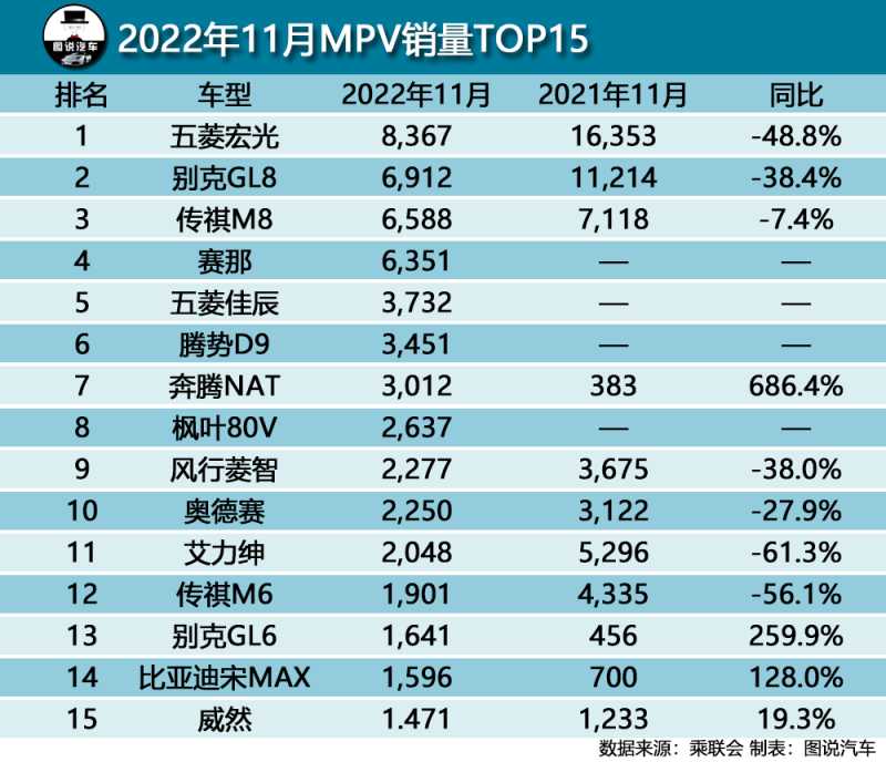 MPV细分市场是最能体现车市寒冬的领域,在11月MPV整体销量只有7.2万辆,同比跌幅13.8%,环比跌幅11.7%,11个月累计销量也刚过84万辆,同比跌幅也是高达14.2%。上榜十五款车型,没有一款月销破万。