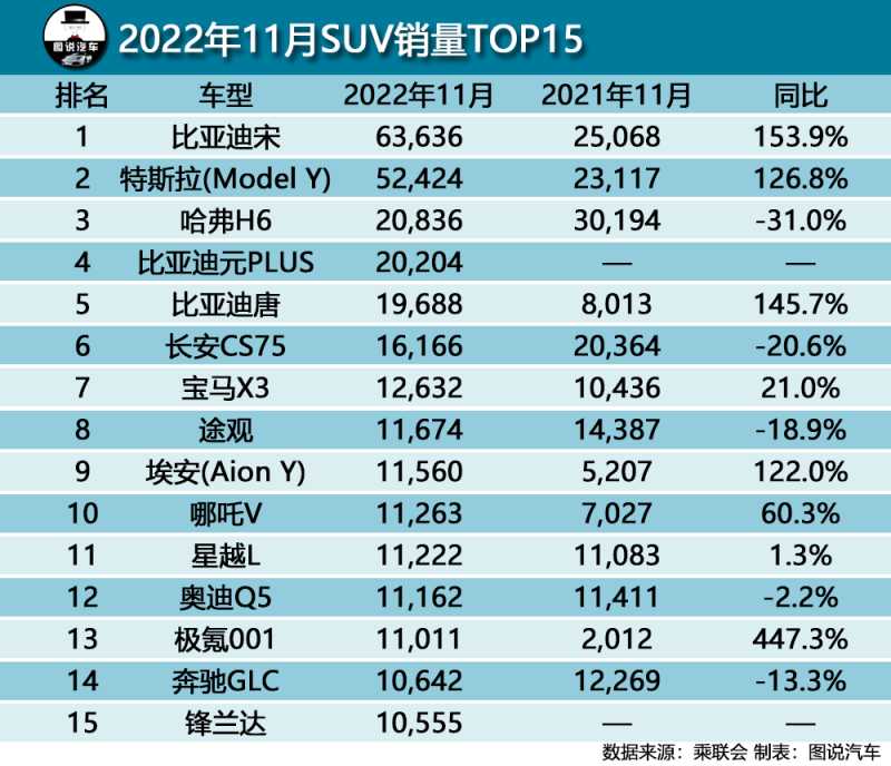 SUV领域——比亚迪宋是哈弗H6的三倍还多,Model Y月销超5.2万辆,国产车占据9席