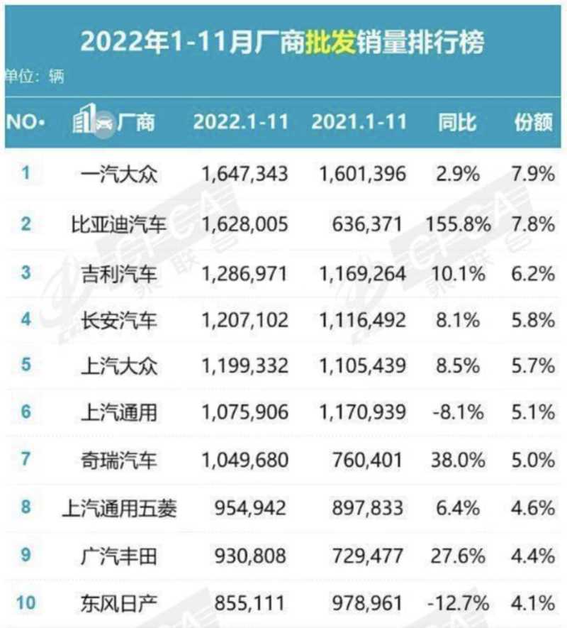 据乘联会公布数据显示,今年1-11月份,已有7家车企累计销量突破百万辆,分别是一汽-?大众、比亚迪、吉利汽车、长安汽车、上汽大众、上汽通用及奇瑞汽车。