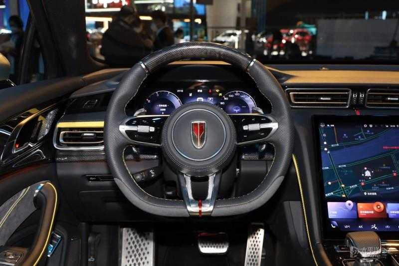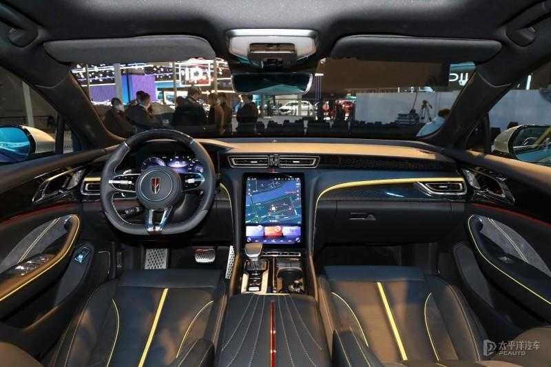 内饰方面,新车采用了与新一代红旗H5类似的设计,空调出风口下方的12.6英寸竖立中控屏显得十分吸睛,,配合电子挡杆,营造科技气氛比较到位。三辐式碳纤维+真皮方向盘多功能方向盘前方为全液晶仪表盘,同时通过换挡拨片。新车前排采用全新一体式靠背设计的运动座椅,包裹性更好,有利于烘托车内的运动氛围。