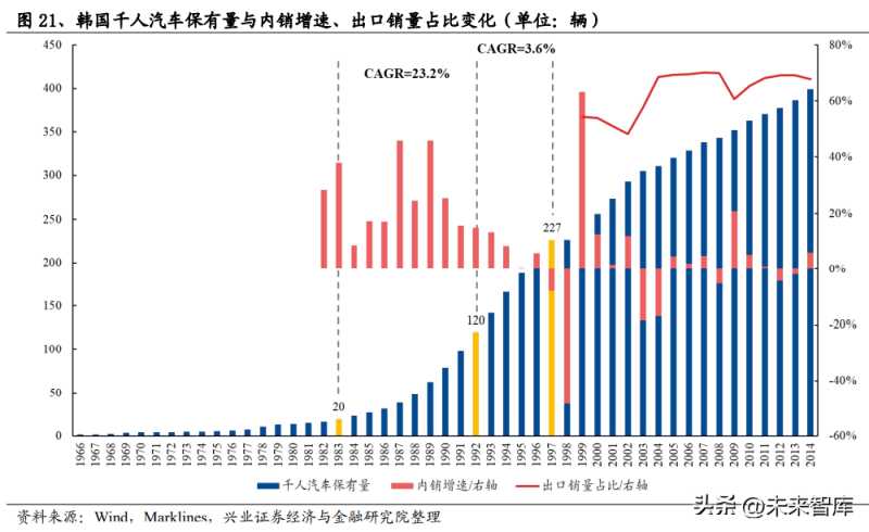 以史为鉴:出海是车企规模扩张和分散经营风险的必然选择。从日本、韩国历史 经验来看,一个经济体的汽车千人保有量突破 180 台以后,市场的成长性减弱, 周期性开始凸显。在日本、韩国的千人保有量达到 180 辆时,出口占比均已超过 30%。对于车企而言,寻找新的增量市场,不仅是规模扩张的要求,也是分散经营 风险的必然。2021 年我国千人汽车保有量达到 214 辆,而乘用车出口销量占比为 7.7%,同年美日韩汽车出口销量占比分别达到 20.6%/46.2%/ 58.6%,即使与非外 向型经济的美国相比,我国整车出海仍有较大的成长空间。