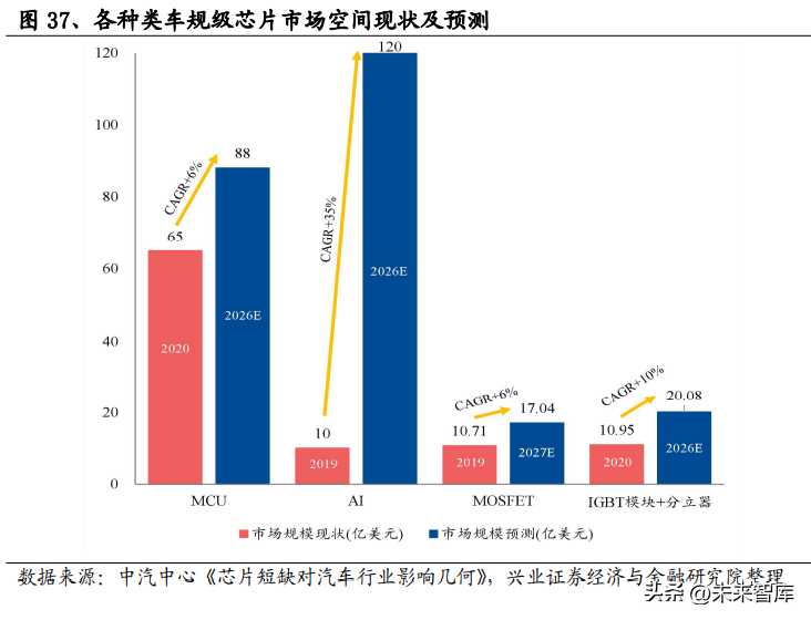 行业集中度相对较高,MCU 芯片现阶段市场空间最大,AI 芯片未来市场空间增 速最快。目前各种类车规级芯片前五大厂商市占率之和均大于 60%,车规级芯片 市场集中度相对较高。MCU 芯片、功率类芯片厂商中前五大均为海外企业,车规 级芯片市场份额基本被国际巨头垄断。根据中汽中心数据显示,2020 年车规级 MCU 芯片市场空间为 65 亿美元,远超其他车规级芯片,2026 年预计增长至 88 亿美元。车规级 AI 芯片 2019 年市场空间为 10 亿美元,预计以 CAGR+35%的速 度迅速扩张,到 2026 年 AI 芯片市场空间将达到 120 亿美元,成为市场空间最大 的车规级芯片。